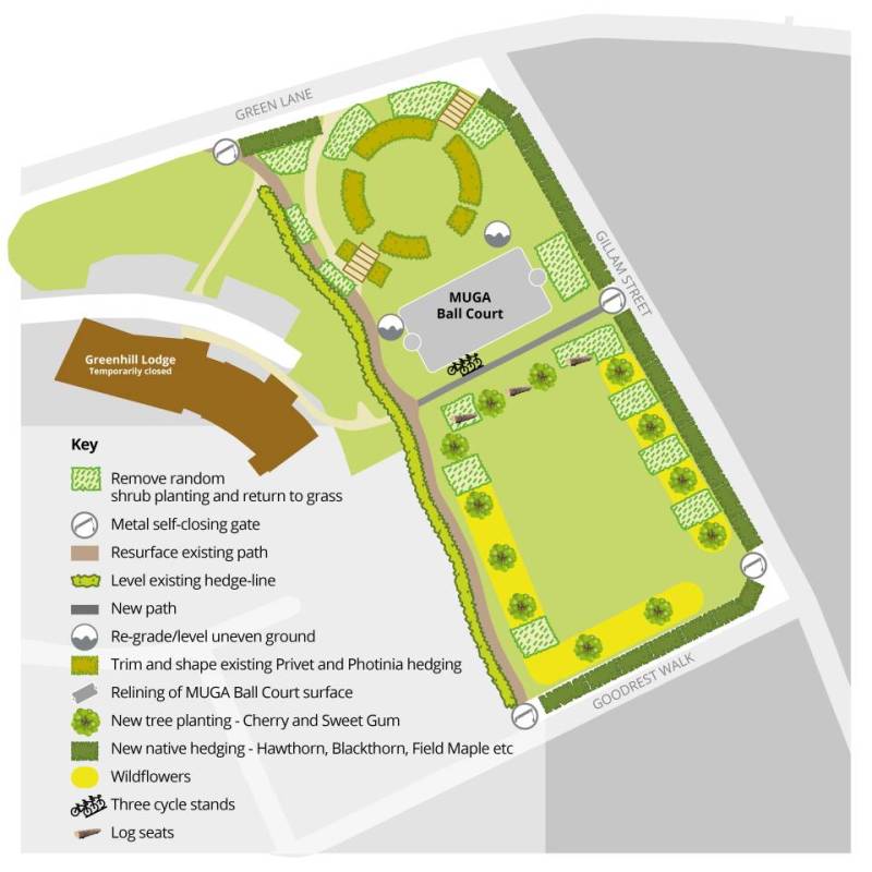 - Upgrading paths from Goodrest Walk to Green Lane, and from Gillam Street past the MUGA