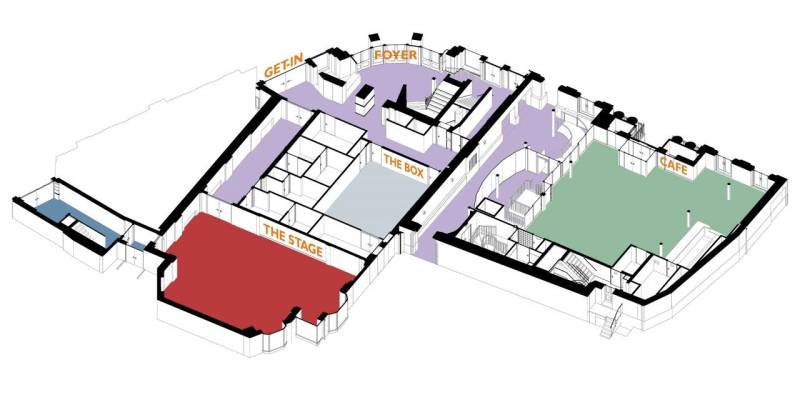 The designs show three multi-use studios, currently named The Stage, The Screen, and The Box, as well as a café that can provide additional performance space, and foyer and reception areas.